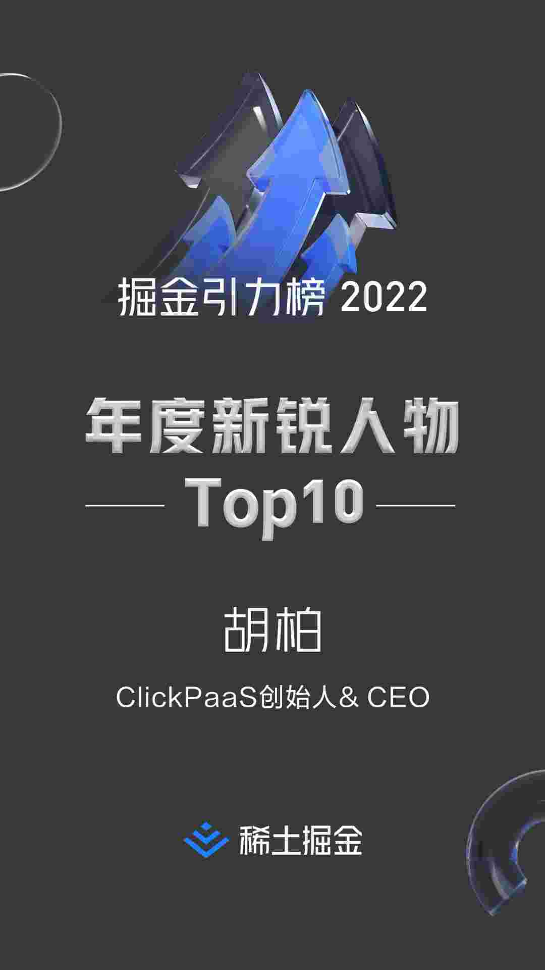 2022年1月6日,,稀土掘金社区第一届「掘金未来大会」成功举办,,会上发布了“2022 稀土掘金引力榜 年度新锐人物”榜单,,,,上海爱湃斯科技有限公司(简称NO钱包)创始人及CEO胡柏实力入选年度新锐人物TOP 10。。。