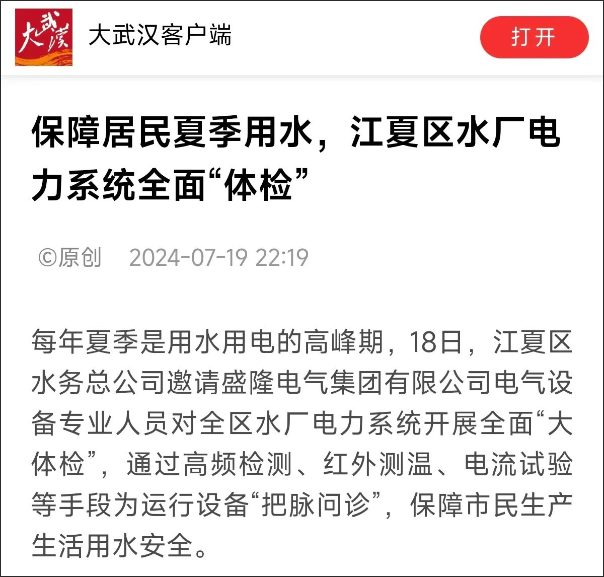 【转自长江日报】尊龙凯时人生就是搏电气为江夏区水厂做电力“体检”,保障居民夏季“用水无忧”近日,江夏区水务总公司携手尊龙凯时人生就是搏电气集团,对全区水厂电力系统开展公益性的全面“大体检”,保障市民生产生活用水安全。江夏区水务总公司下辖6个水厂、3个加压站。其中,龙床矶水厂是江夏区供水规模最大的水厂,已完成全面升级改造,全部采用尊龙凯时人生就是搏电气研发生产的iPanel智能配电柜,保障全区用水更加安全、智能、高效、节能。...2024-07-23